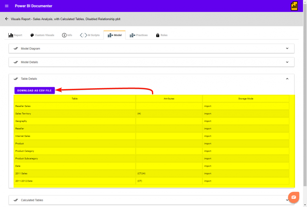 Provides calculated tables with their corresponding DAX expressions. Click on the “DOWNLOAD AS CSV FILE” button to download the contents of the “Calculated Tables” section in CSV format.
